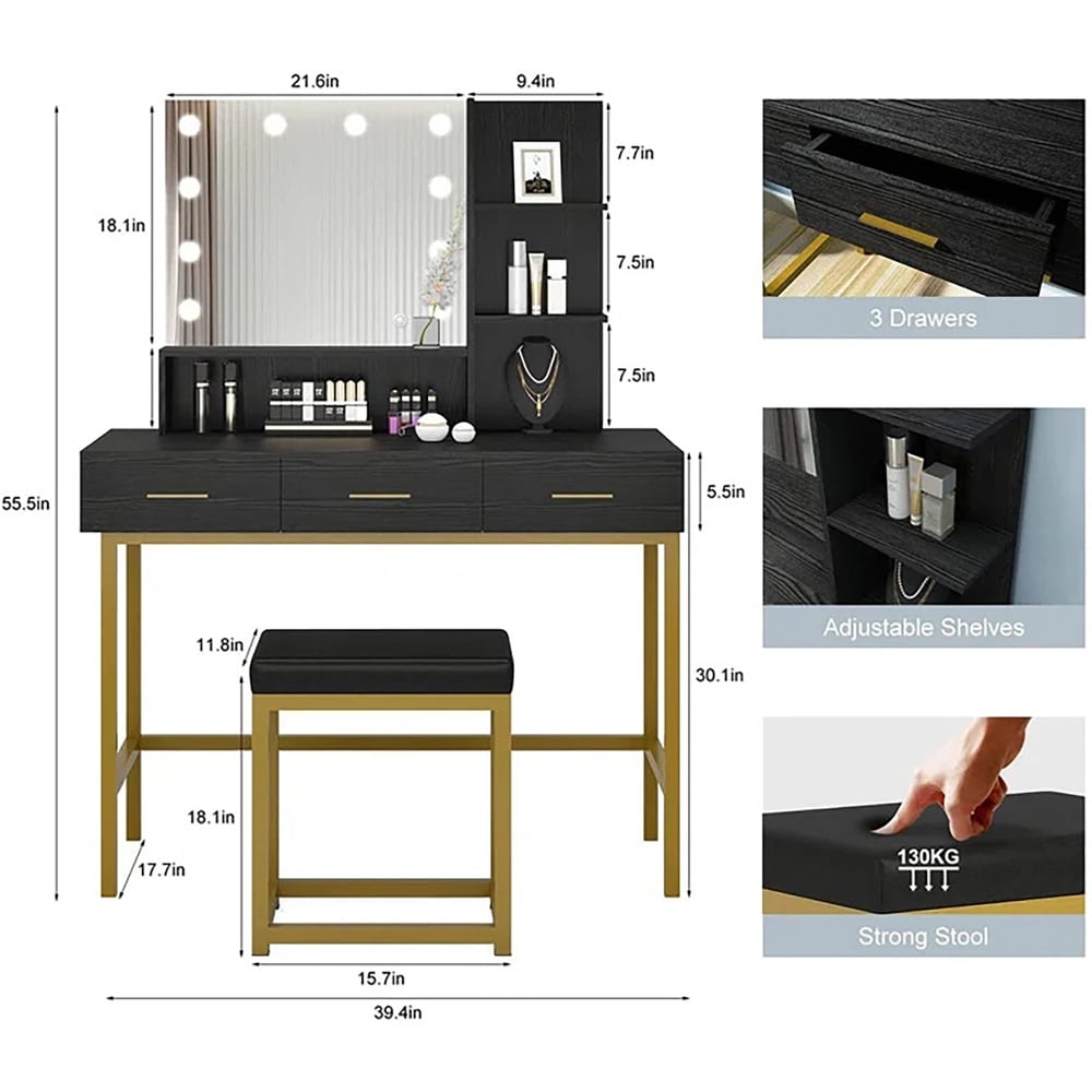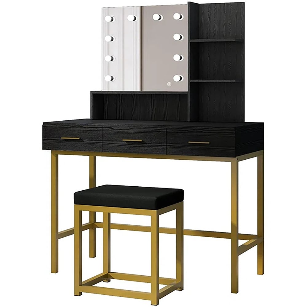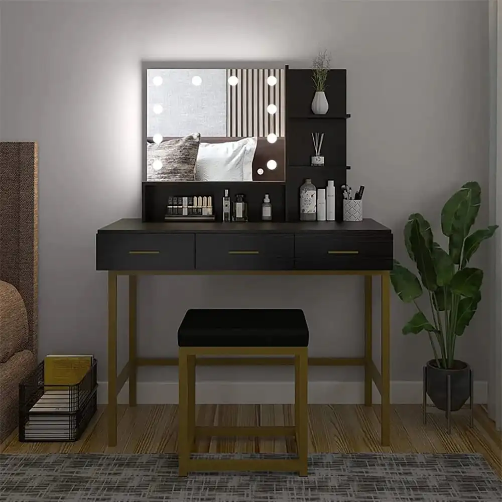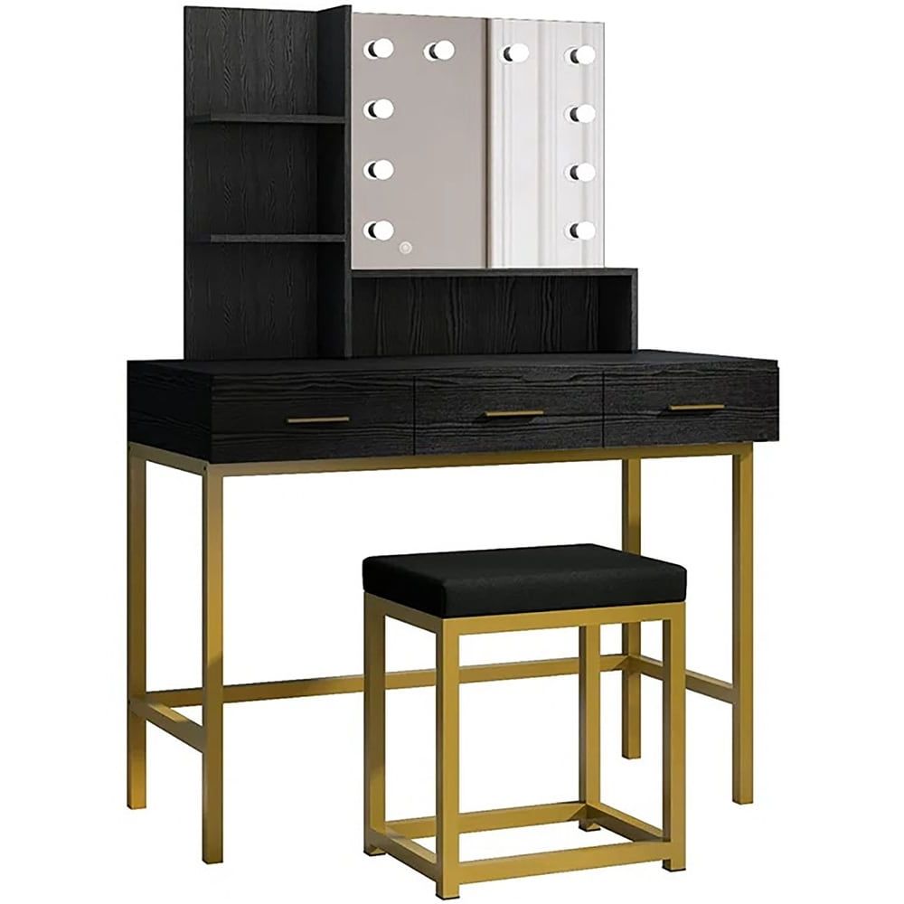 Every girl wishes to have a glamorous dressing table with all her jewelry and makeup. Don’t hesitate. This stylish vanity table set comes with mirrors, LED bulbs, storage drawers and a stool. With a stylish & elegant design, a modern appearance, and golden metal table legs, this vanity table will be an ideal gift for ladies and brings contemporary to your home. Made from high-quality material, this modern and unique piece features a finish that matches almost every room’s decor. With good storage, there is ample space for a variety of brushes, bottles, and accessories. Nothing is better than starting the day off looking fabulous with great makeup. Take this vanity desk home, with it, you can get the best makeup.